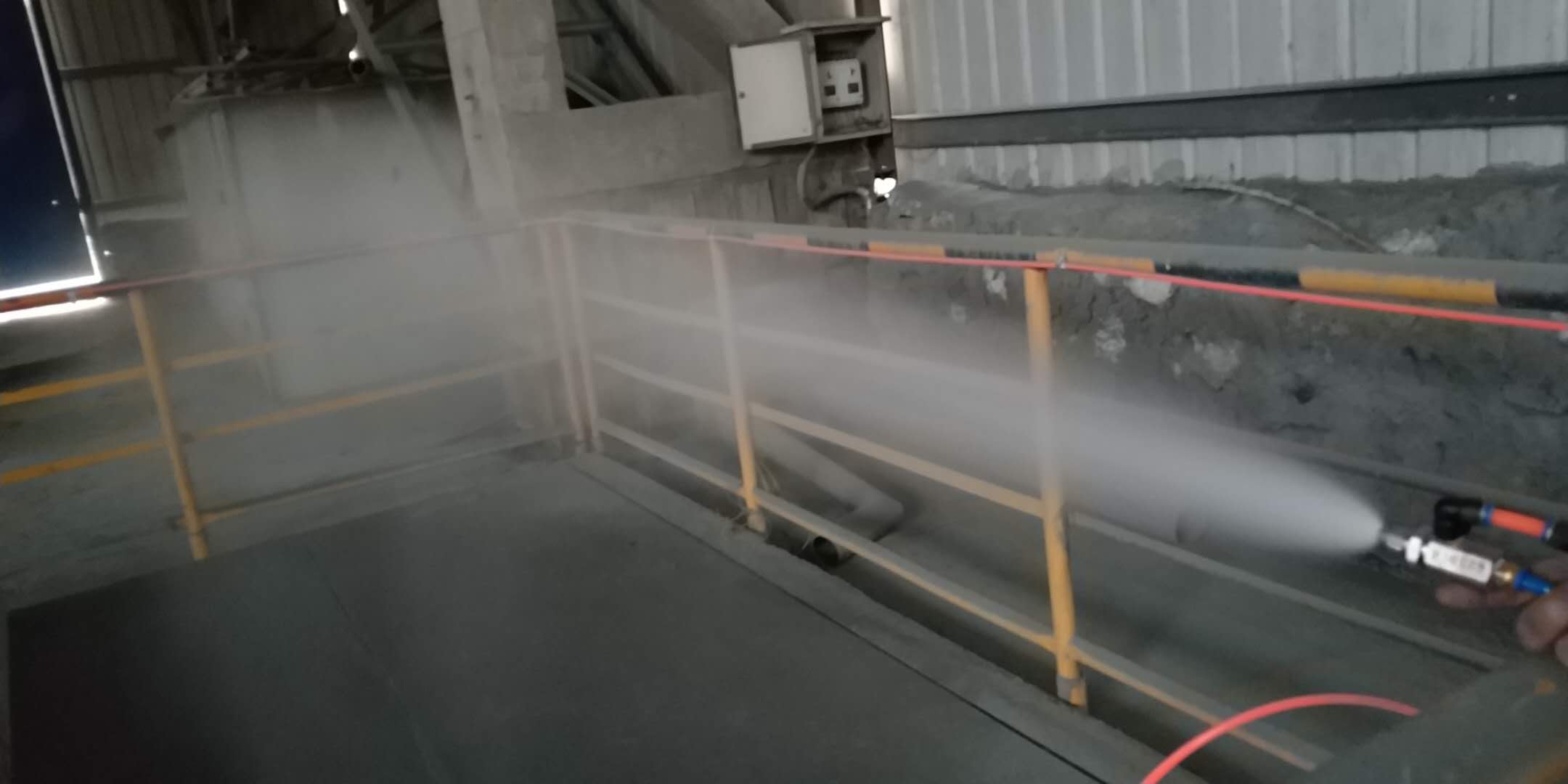 2.對容易引起塵埃的堆場噴水除塵時,噴出的霧粒細小、與飄起的塵埃接觸時,形成一種潮濕霧狀體,能快速將塵埃抑制降沉;