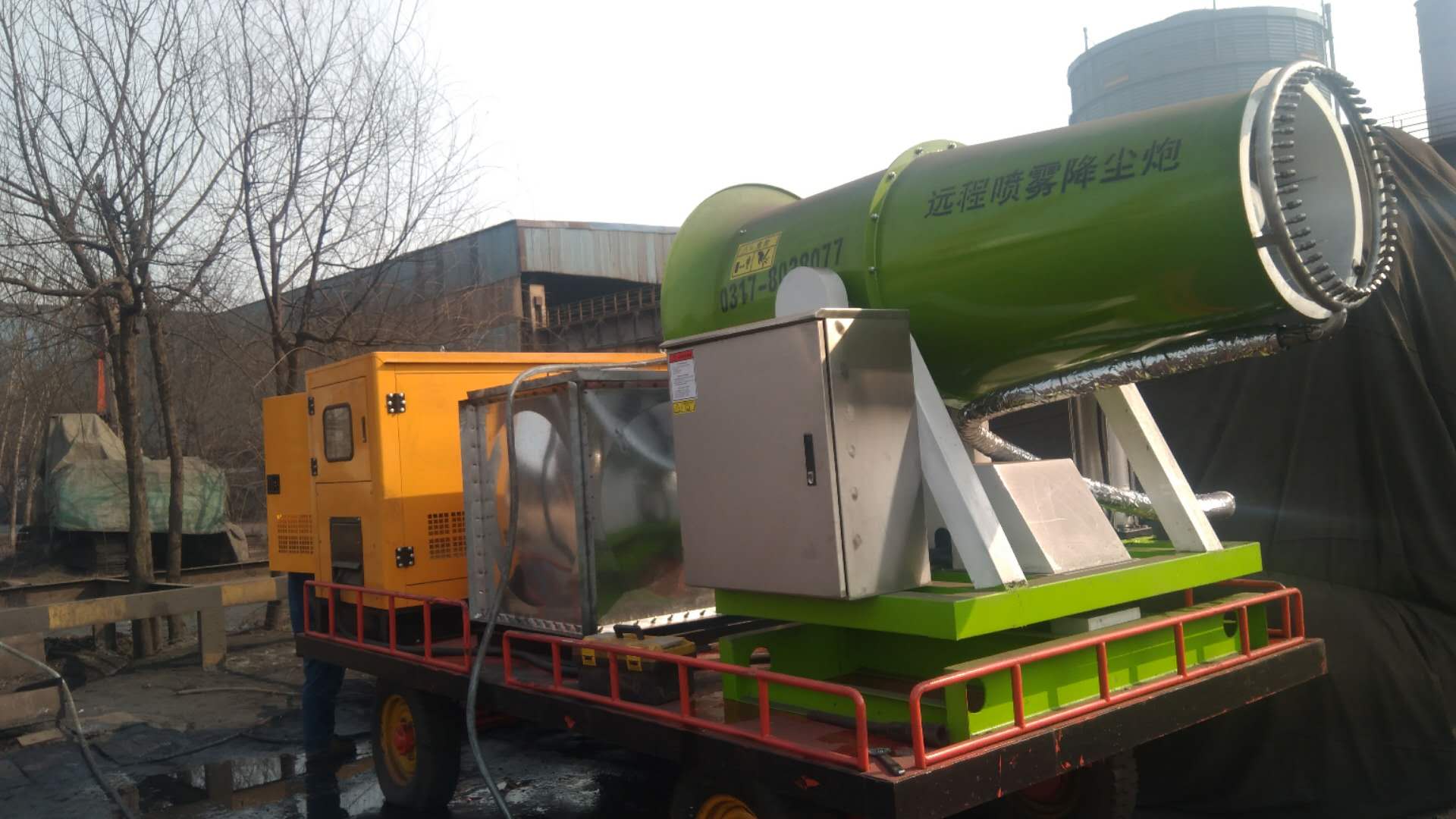 除塵霧炮機主要作用是噴霧抑塵,同時具備灑水的功能,有效抑制揚塵的產生。在污染區域進行液霧降塵、分解淡化空氣中的顆粒濃度、將漂浮在空氣中的污染顆粒物、塵埃等迅速逼降地面,達到治理空氣的明顯良好效果。
