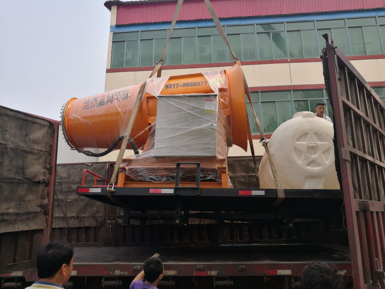 100米射程除塵噴霧機是我公司生產(chǎn)的較大型號的除塵噴霧機之一,自重2.3噸,風機長度接近3米,這種高射程的大型設(shè)備有時候裝車也是一件很費勁的事,由于體積較大,一般車間吊裝很難完成因此這種大型設(shè)備裝車一般使用大型吊車裝車,最近大射程除塵噴霧機一直在出貨,很多揚塵企業(yè)也在不斷的更新除塵噴霧機,從小型號到大型號發(fā)展。